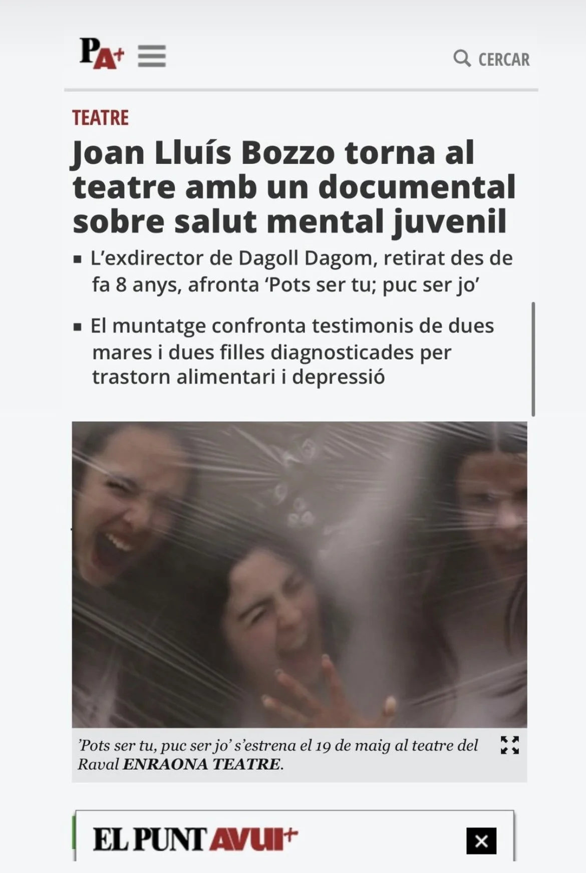 Insight: La obra quiere romper el muro del silencio y plasmar la realidad de la salud mental, dando visibilidad a todas aquellas personas que sufren esta enfermedad. La compañía nace con este propósito y fruto de ello es su primera obra. “Pots ser tu, puc ser jo” que narra la historia de dos adolescentes y sus madres, a través de escenas basadas en hechos reales con la dureza que ello conlleva.
